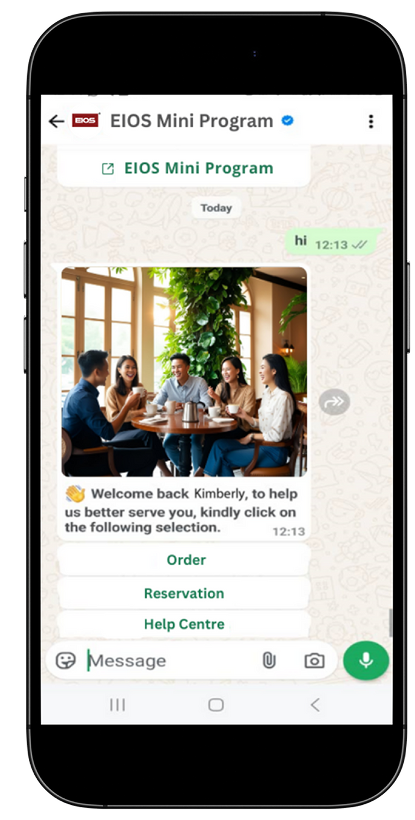 EIOS mini program is a lightweight application that runs within a host platform or any messaging platform such as WhatsApp, Telegram, Line. It’s designed for quick access, minimal storage use, and seamless integration with a larger ecosystem such as EIOS.